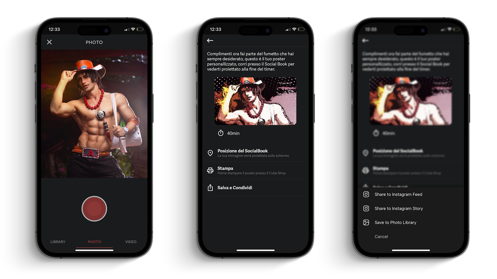 Ora la vostra immagine sarà la chiave per un’avventura senza limiti! Social Book è un’installazione che vi permette di immergervi completamente fra le pagine e la china del vostro fumetto preferito. Con la magia della tecnologia avanzata, il tuo volto e le tue espressioni saranno catturati in modo impeccabile e catapultati nelle avventure dei tuoi personaggi più amati. Ti sarà possibile salvare l’immagine e condividerla ovunque tu voglia, o ritirarla allo shop nel suo formato poster.