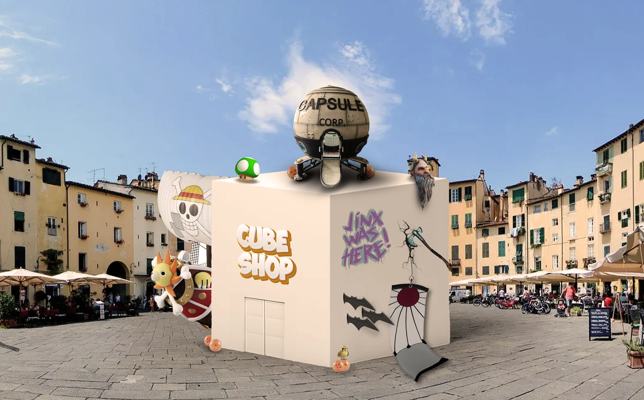 L’ultima installazione è uno shop unico nel suo genere. Si presenta come un gigantesco cubo anonimo, ornato e arricchito dagli elementi iconici dei personaggi più famosi. Con questa installazione volevamo rappresentare un luogo dove i protagonisti delle varie avventure potessero riposarsi e appoggiare i loro effetti personali e al tempo stesso smuovere l’interesse dei passanti, che mossi dalla curiosità di sapere cosa vi si può celare, entreranno nello shop.